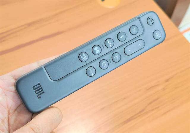 条形音箱的机身设计纤细不占据空间,直接摆放在电视柜再适合不过了,顶部配备加减按键和返回键,满足我们盲按的需求。