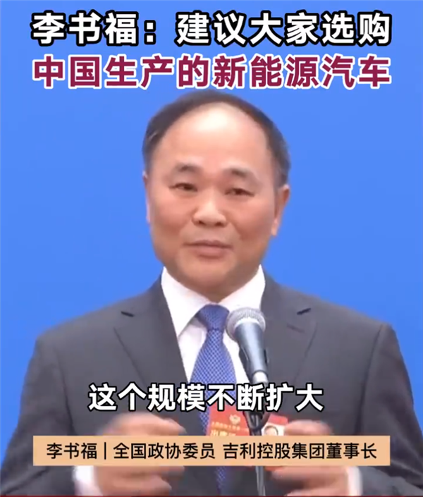 3月4日,全国政协委员、吉利控股集团董事长李书福表示,现在中国每年投放市场的新能源汽车产品很多,琳琅满目,而且每年都出现一些爆款的新能源汽车产品,排队买不到,“我借这个机会建议大家可以选购中国生产的新能源汽车产品。”