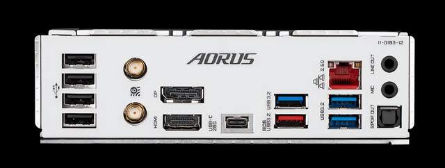 在主板的I/O接口部分,技嘉小雕WIFIB760M AORUS ELITE AX D5配备了四个USB 2.0、两个Wi-Fi 6E网卡SMA接口、一个DP口、一个HDMI口、一个Type-C USB 3.2 Gen 2x2、一个USB 3.2 Gen 2 Type-A(红色)、三个USB 3.2 Gen 1(蓝色)、耳机与麦克风3.5mm音频口以及SPDIF光纤音频接口,整体规格豪华齐全。