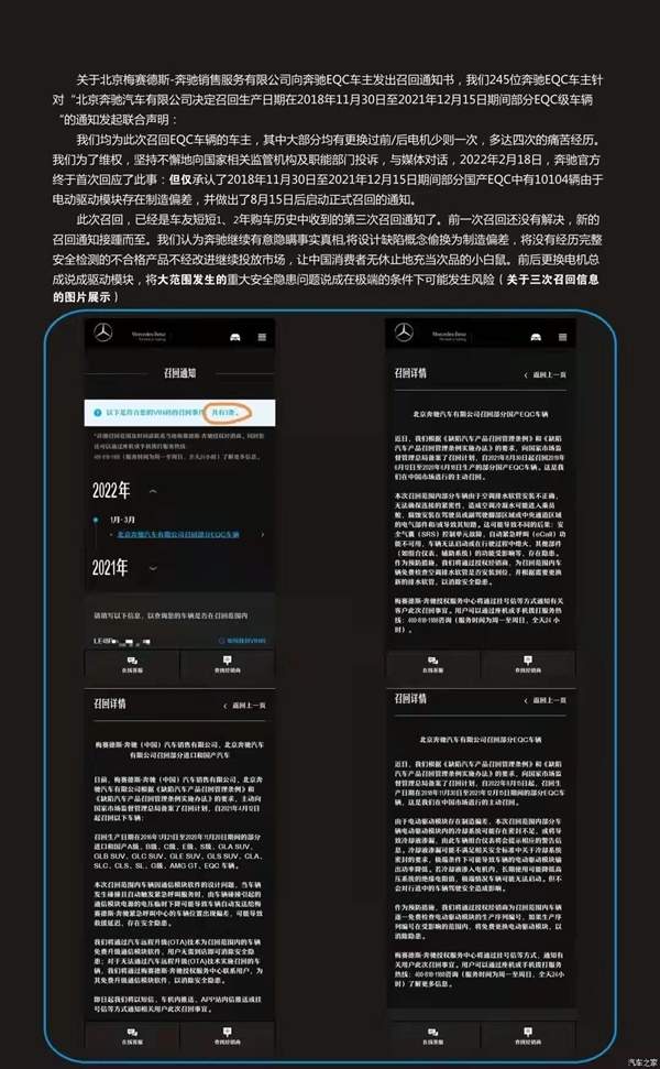 而在去年年初,有数百位车主在网络上在线维权,奔驰EQC冷却液烧坏电机已成为普遍现象。在车主的持续投诉下,奔驰方面启动了召回程序。