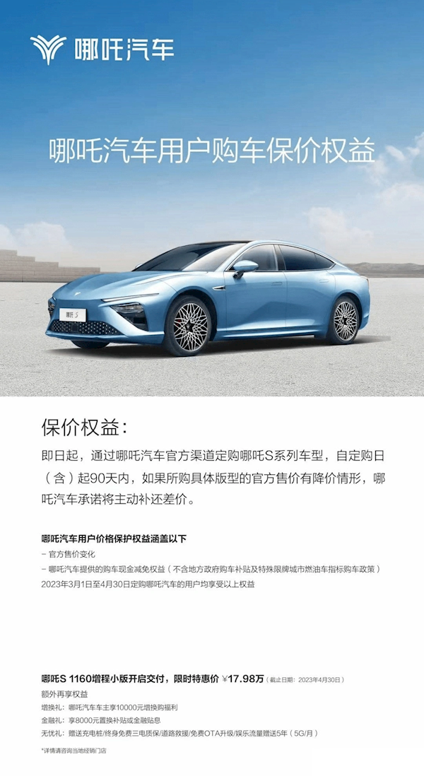 3月15日,哪吒汽车宣布跟进保价政策,保价车型为哪吒S全系。同时,对哪吒S 1160增程小版推出限时优惠。