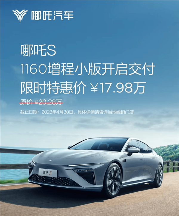 限时优惠方面,截止至2023年4月30日,哪吒S 1160增程小版在官方指导价20.28万元基础上优惠2.3万元,限时特惠价仅17.98万元。