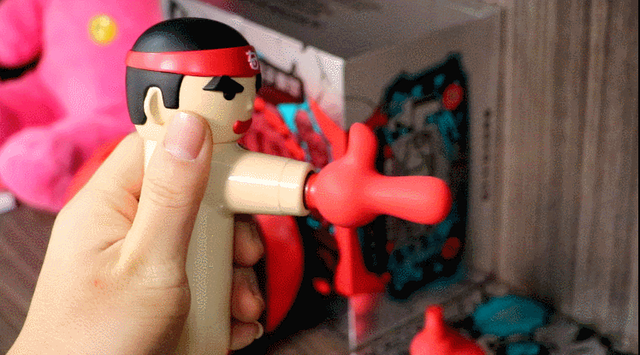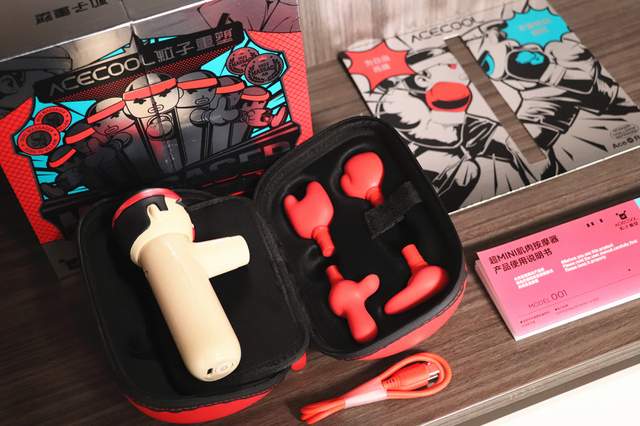 配件方面,它也确实很有功夫小子的概念意思,除了筋膜枪主体之外,还提供了多款功夫造型按摩头,以及使用说明书和一根红色充电线。