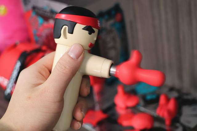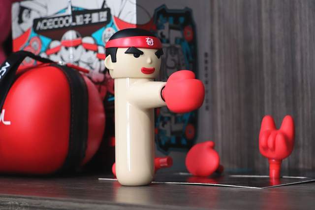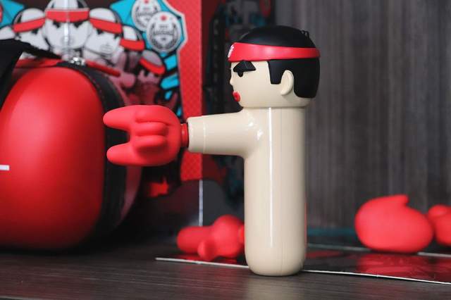 ACECOOL粒子重塑筋膜枪的头部是功夫小子的形象,印制“奋”字的红色头巾,浓眉红嘴的形象还是非常有意境的,这种设计在筋膜枪产品上应该是很少见的,很独特。
