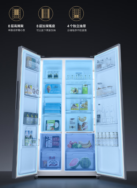 同时,它还配备了银离子抗菌技术,抗菌率达 99.99%,可抑制细菌滋生,营造健康卫生储鲜环境,同时搭载变频风机和变频压缩机,双变频一级能效节能低噪声,综合耗电量为0.99度/天。