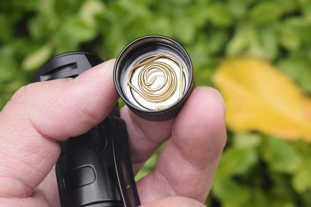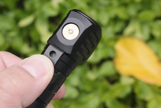拐角灯的体积小巧而精致。中筒的上半部分光滑,并没有作滚花设计,这是为了方便拆装抱夹。则下半部分则尾盖则分别采用了横、竖条纹来作防滑处理。