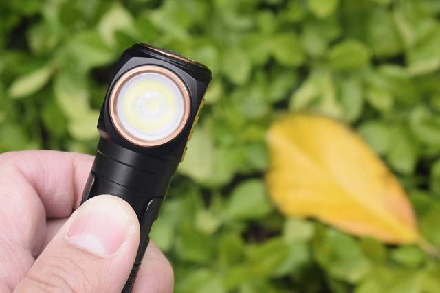 HM61R V2.0采用了红白双光源设计,其搭载了一颗Luminus SST40灯珠作为主光源(白光),其最高亮度可以达到1600流明(光强为6566坎德拉),射程162米;而副灯(红光)则是2835红光LED,虽然亮度最高只有5流明,但也足够日常所用了(开启头灯后长按可切换为红光)。搭配TIR透镜有着出色的泛光表现。
