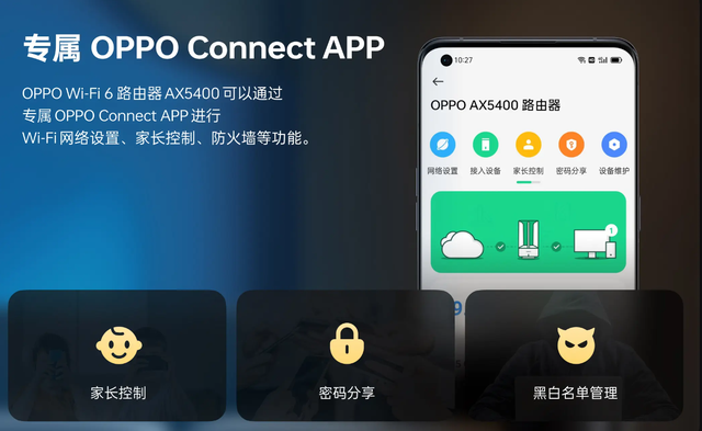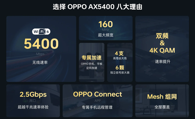 其它方面,OPPO Wi-Fi 6 路由器 AX5400 支持 Easy Mesh,能实现跨平台、跨品牌路由器间快速、便捷 Mesh 组网,扩大 Wi-Fi 网络覆盖。自研科技更快更稳配备 4 根高增益天线和 6 颗独立信号放大器,搭配 OPPO 自研抗干扰算法,可让 Wi-Fi 信号传输距离更远、更稳定。