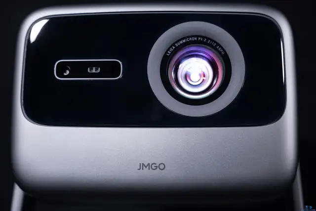 前面板是简约风格的设计,JMGO Logo之外只有一个传感器窗口的布局,按照我的理解,内部是一对超声波测距传感器用于处理自动对焦,另一个估计是环境光以及画面自动梯形矫正采样用的视觉传感器。说起自动聚焦我想夸一下坚果,这个功能确实方便,菜单里操作点一下焦点就准了,比起其他投影要目视银幕手动调节方便了很多。