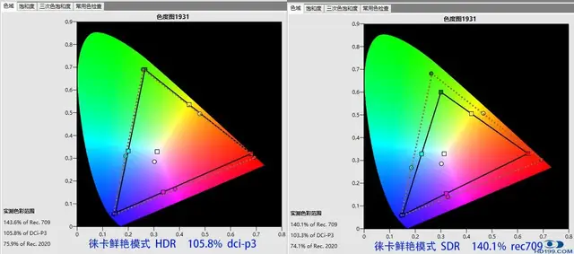 徕卡鲜艳模式的色域覆盖如下图,HDR色域覆盖依旧不错,但sdr模式就放飞自我,直接按照dci-p3色域处理了。