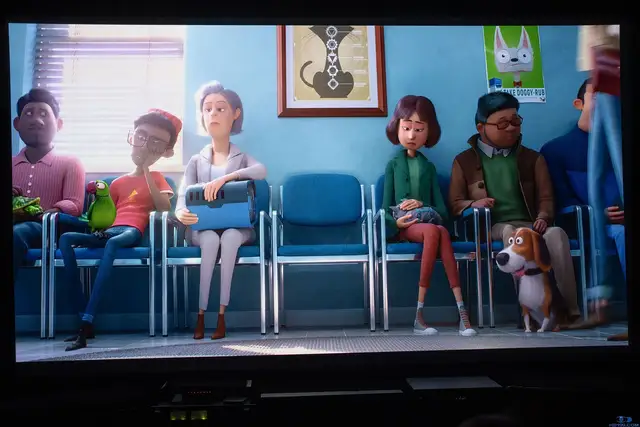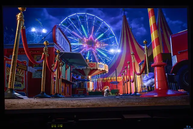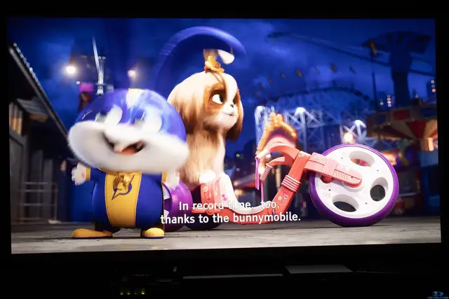 很多时候,我们看到的“散斑”可能是素材本身的彩色噪点,因为彩噪颗粒比较细,超过了投影的物理分辨率,但是我们的视频处理电路又不想妥协丢失细节,还是力争把素材里的彩噪还原回来。这么一来的结果就是依旧是彩色颗粒还原,但是会比原片的粗大一些,在特定的高增益幕布上看起来明显,让大家误以为是散斑了。下面这组动画片的屏摄,就能说明问题。动画片的制作一般是很干净的色彩,所以还原的画面看起来也很纯净的。