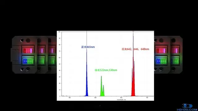 通过前面测试的3色激光光谱图分析中可以看到,厂家在散斑减弱技术上只提了LSR机内震动动态消散斑专利技术,却没提多波长6p减低散斑,其实这是日亚提供的和电影院RGB放映机相似的多波长消散斑技术,这个型号为NUMB12T的坚果定制模块同样应用了3个不同波长红光,2个不同波长绿光和一个蓝光的6p配置。