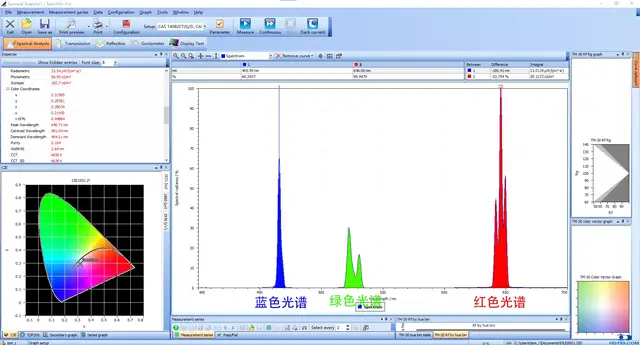 之前3色激光器很昂贵,制成的rgb影院激光放映机都要接近百万的价格。坚果N1区区不到万元的投影机是否真的采用了3色激光器作为光源呢?为了得到准确答案,我使用德国2.5nm光学半带宽的光谱仪,开始测量。