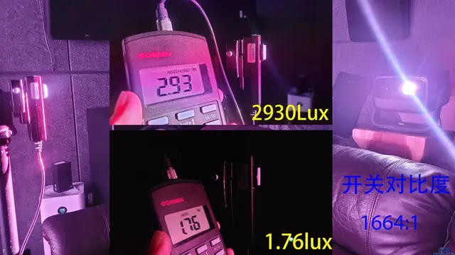 照度计最高329LUX的读数,按照150寸幕布大小,1.0增益换算,实际流明 输出为:2040lm。这里要说明的是,不同的照度计测量由于光谱 差异,比如可见光和LED以及激光之间的差异,他的读数会有偏差。加上N1 Ultra的激光驱动要随着一定频率轮转输出RGB的光,这种光功率的脉动会加大测量偏差。