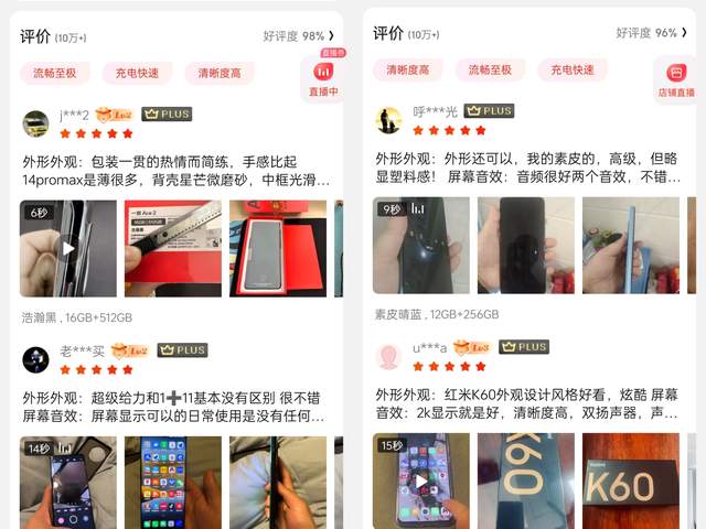 两者都是10W+的销量,可见受市场欢迎程度,一加Ace2好评率98%,200+差评,有用户对于耗电量不够满意。Redmi k60的好评率96%,差评600+,有用户对于发热不够满意。相对来说一加Ace2好评率还是要高于Redmi K60不少的了。