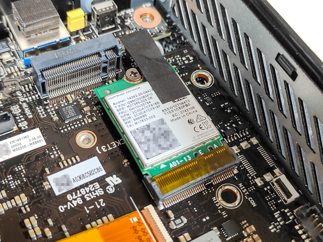 M.2固态硬盘槽就在无线网卡的上方,安装也就是拧一颗螺丝的事情不再赘述,原装无线网卡是一张AX210,算是现在很主流的中高端无线网卡,支持蓝牙5.2,正常不用换。