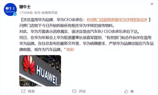 对此,最新消息称问界门店将于今日开始拆除所有相关华为字样的宣传物料。