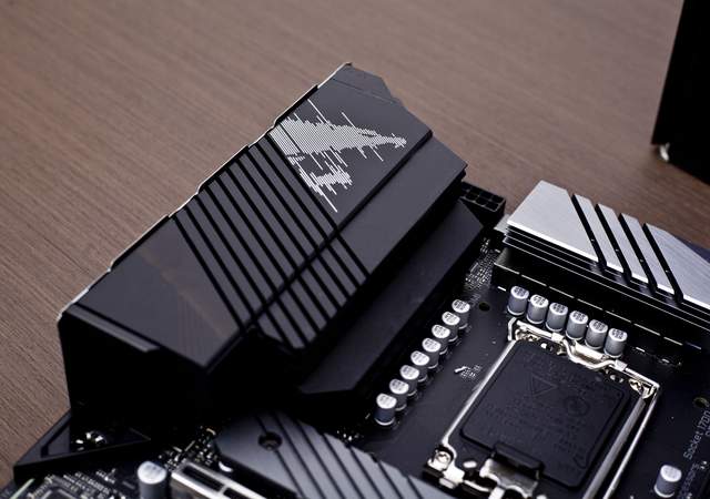 主板的芯片组上覆盖的是灰色的散热片,上面有不规则的斜线以及AORUS的LOGO,看起来很有个性。