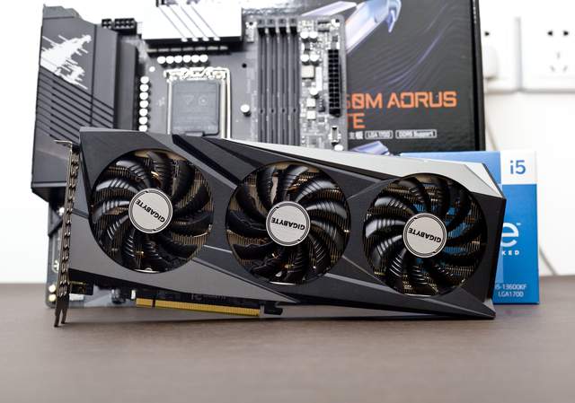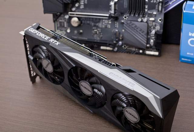 显卡部分,这次使用的是技嘉的RTX3060 GAMING OC魔鹰12G,它搭载的是经典的风之力散热系统,风扇上有针对气流优化的开槽,并且三把风扇为正逆转设计,散热效能方面很有保障。