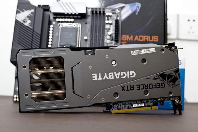 显卡的背面部分是全尺寸的金属背板,上面有GEFORCE RTX以及技嘉的LOGO,尾部处还有辅助透气的散热格栅。