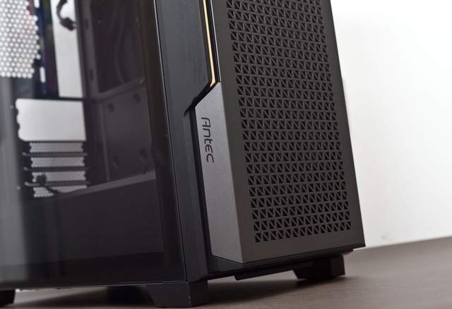 铁灰色的散热面板侧边是不规则的造型以及黄色的装饰线条,最下方位置是安钛克的LOGO,整体造型简约又不失个性。