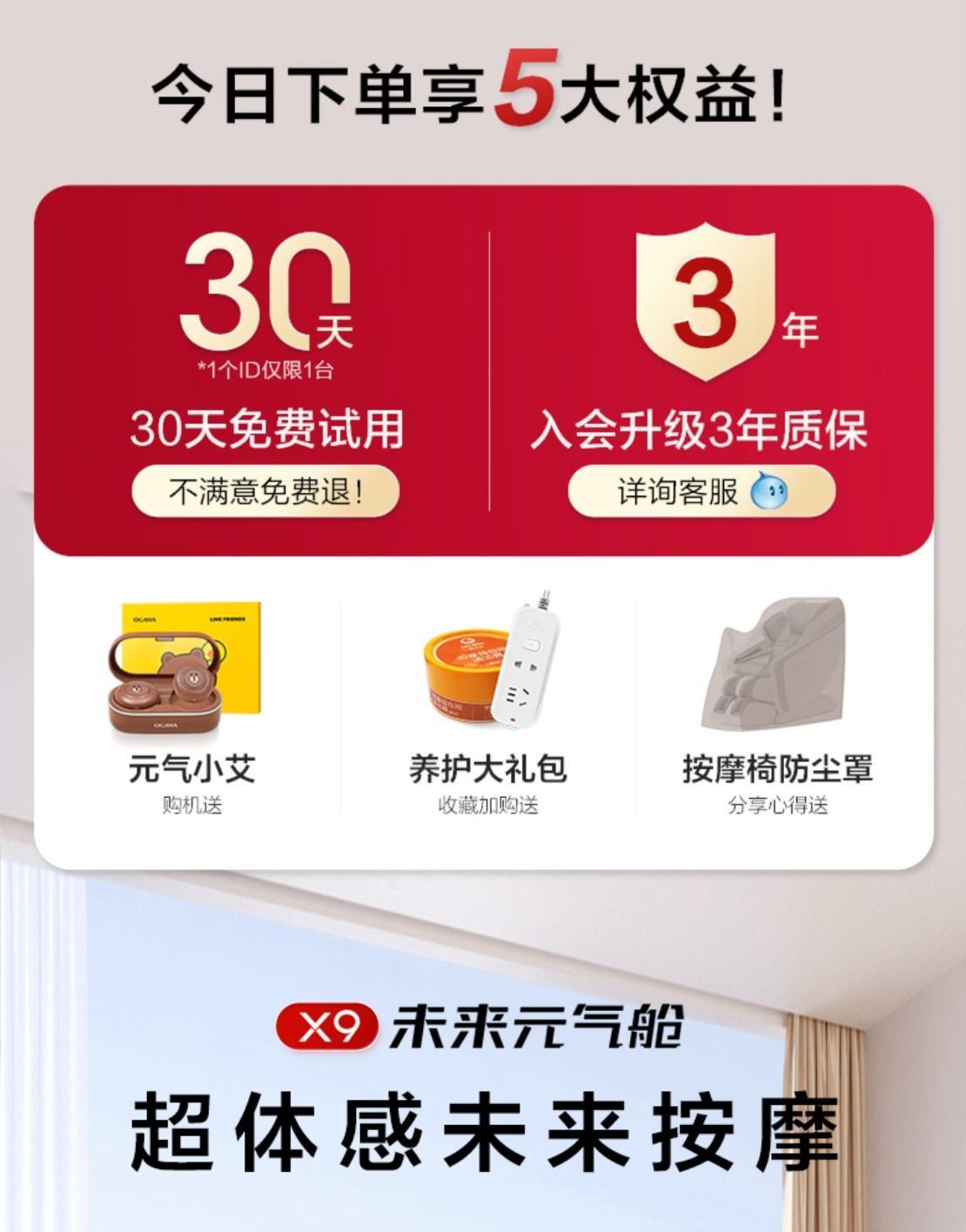 不过科技总是在发展,我也时时在关注按摩椅的相关信息,发现技术已经不断在进步。比较下来奥佳华比较有名,而且产品系列多,功能很丰富,且上市公司品质和售后服务也比较有保障。最终,我看上了这款奥佳华X9未来元气舱按摩椅,感觉它解决了我的几个担心: