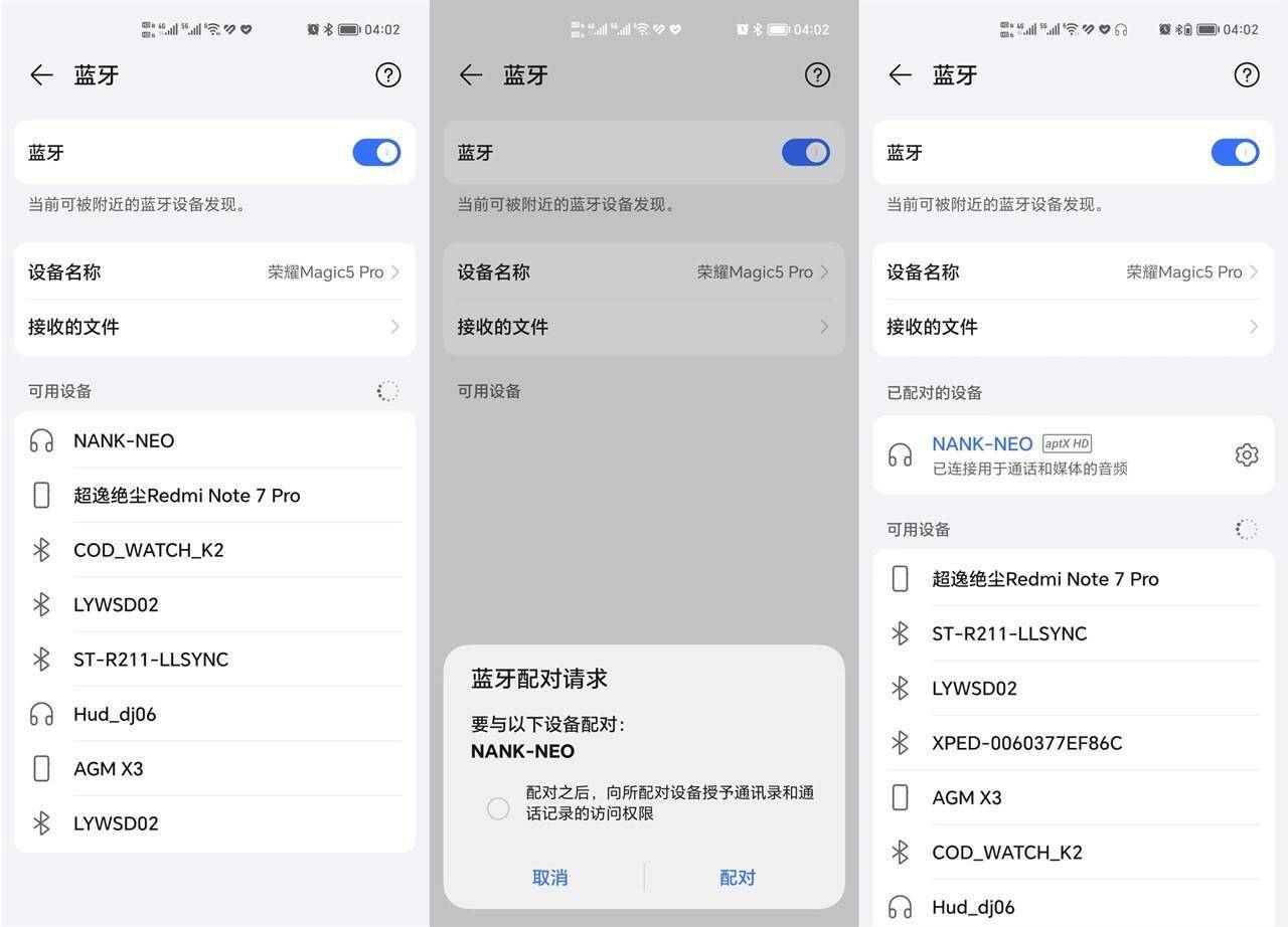 打开智能手机、台式电脑、笔记本电脑的蓝牙管理页面,将南卡NEO蓝牙耳机开机后,可以看到NANK-NEO的可以设备,连接绑定之后可以看到APTX-HD的音频解码协议,同时也支持ACC、SBC解码协议,能够在聆听高清音乐时获得更好的使用体验。