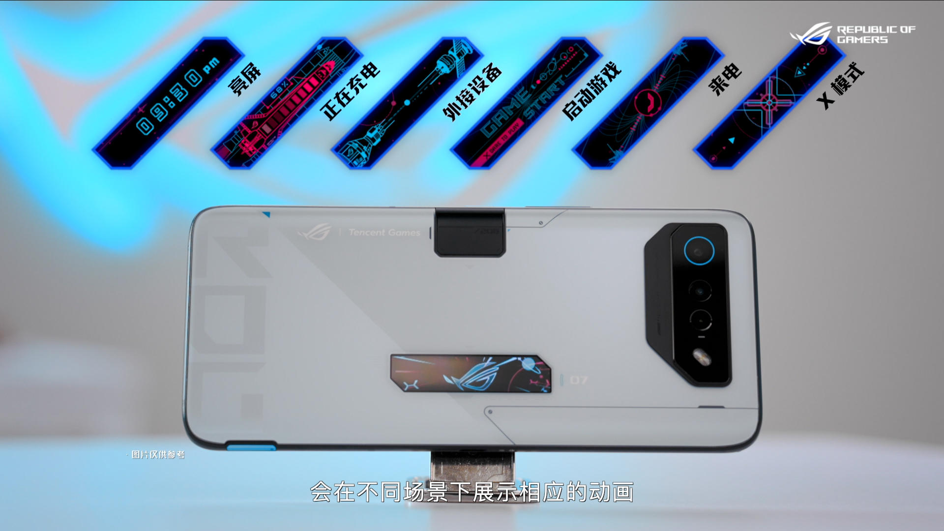 此外,腾讯ROG游戏手机7 Pro在机身背部还搭载了ROG个性视窗,可以游戏、充电、X模式、来电等场景均可显示个性化动画。当然还可以自定义设置,依据喜好创建个性化动画显示。