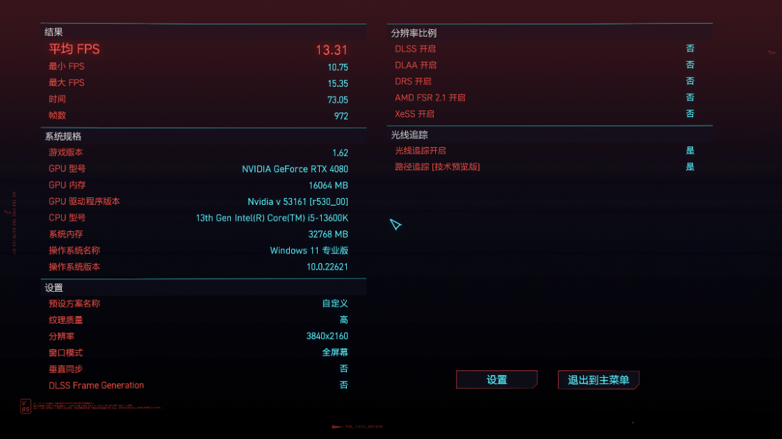 关闭DLSS时,游戏的实际帧率约为13.31FPS左右。开启超级性能模式下的DLSS 2.0后,游戏实际帧率约为78.13PS左右。继续开启DLSS 3.0后,游戏实际帧率约为111.27FPS左右;