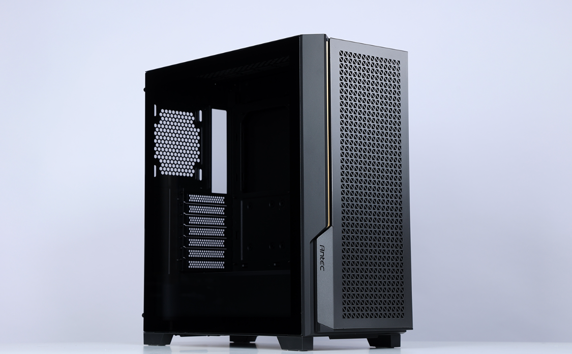 机箱前脸采用独特的金属开孔设计,搭配全尺寸防尘滤网,散热与防尘效果同时拉满,并支持免工具快拆。左侧下方有一个Antec品牌logo,金属网孔面板一侧还有一条黄色线条点缀,整体辨识度非常高。
