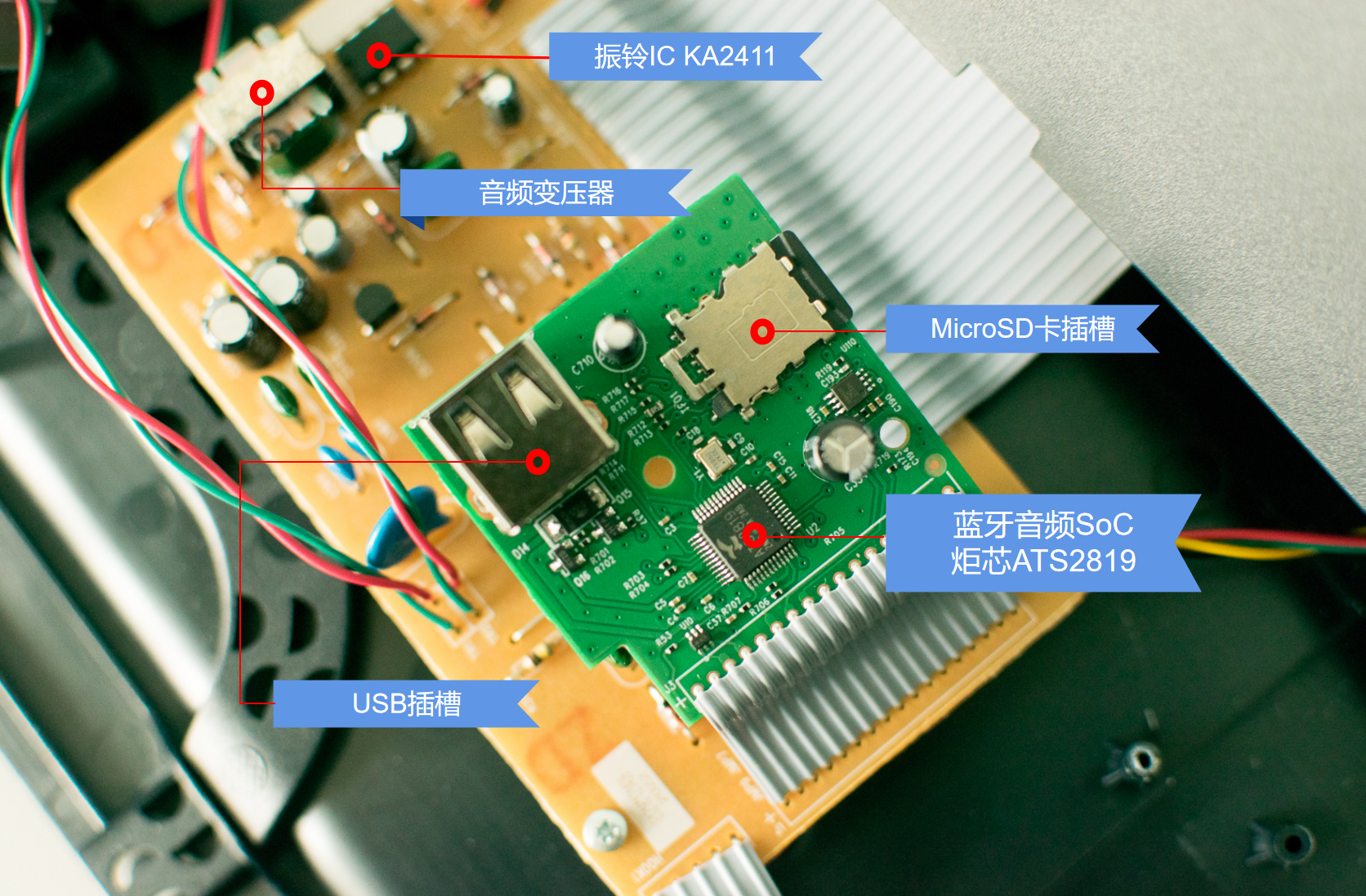 拧开螺丝,打开卡扣,就把电话机拆开了。在USB接口这里有块电路板,存储卡很大概率就在这里。