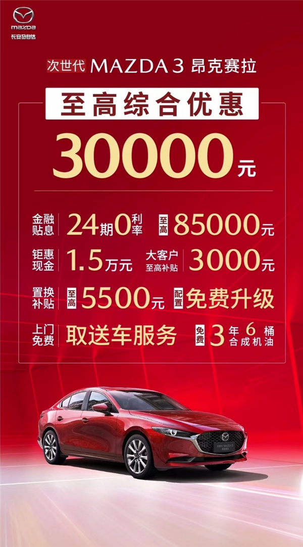 阿马自达3昂克赛拉提供至高3万元的综合优惠,包括1.5万元优惠(大客户至高补贴3000元)、置换5500元补贴并享配置免费升级;同时提供24期0利率金融贴息,可享至高8.5万元,还提供免费取送车服务和3年6桶合成机油。