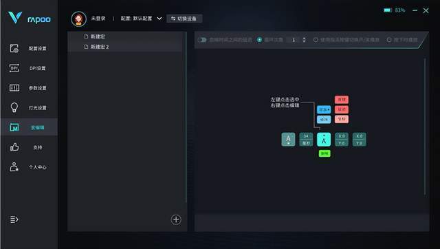 通过雷柏的官网可以下载鼠标驱动,这时候可以看到当前电量,调整DPI档位、档位数值。灯光效果方面具有1680万色彩RGB背光灯,五种灯效在滚轮、Logo、尾部同时炫酷点亮,当然还可结合个人喜欢做设计。