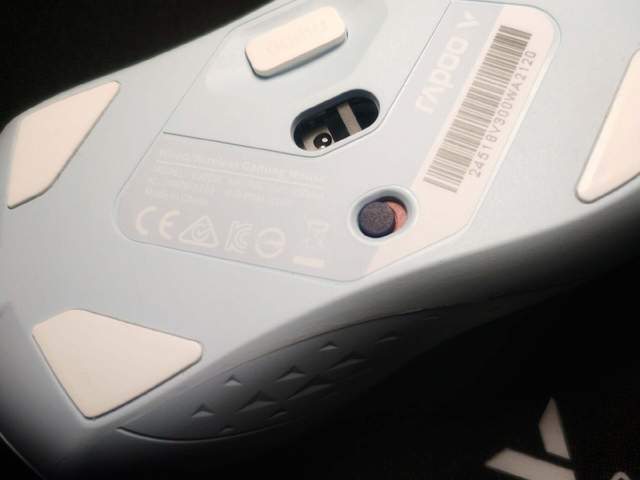 底部的外侧可以看到4处面积很大的特氟龙材质脚贴。这在使用中为鼠标带来低摩擦,顺滑移动以及耐磨的体验。
