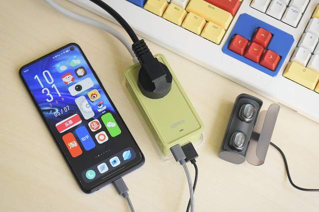 侧颜的两小一大三个插孔像极了呆萌的笑脸,如此讨巧的设计放在桌面上能够使人时刻保持心情愉悦。此款充电器共有三种配色,即流沙黄、墨玉绿和太空灰。几经考量下最终选择了绿色,放在电脑桌前,偶尔看一眼,也算是缓解视力疲劳,颜值上也会更耐看些。
