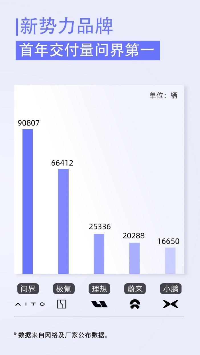 对于一个全新品牌来说,首年的销量表现至关重要,既代表产品突破市场的实力,又展示出用户对于品牌的认可度。在华为深度赋能下,自首款车型问界M5交付开始,问界一年推三款新车,交付超9万辆,远超“蔚小理”及极氪等新势力品牌同时期的销量,为品牌长期发展打下了良好的基础。