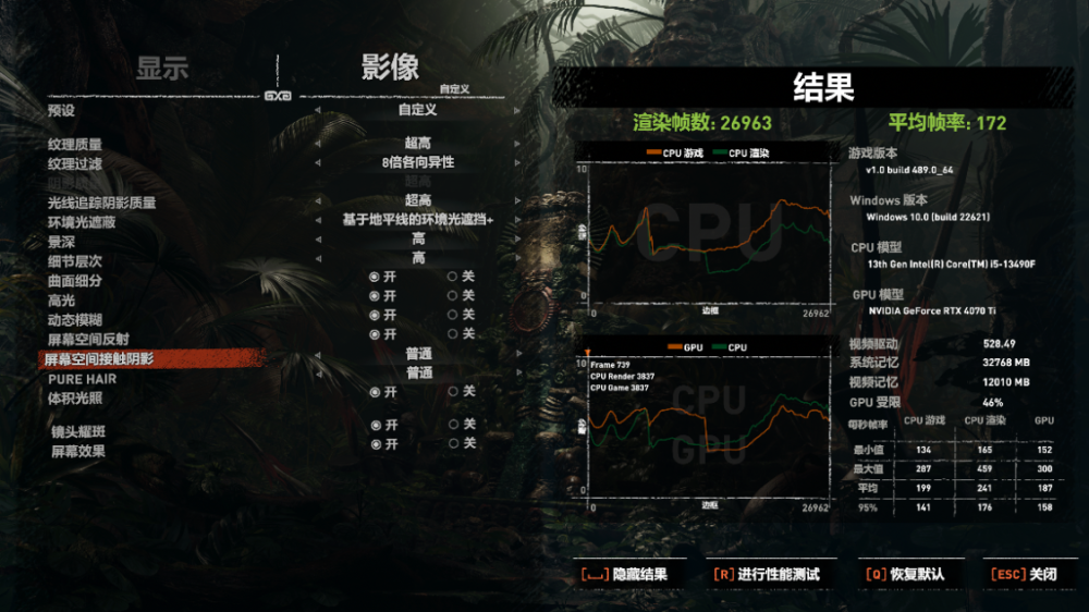 在《古墓丽影:暗影》当中,我们把分辨率设置成4K,画质、光追质量和DLSS均开到最高,游戏自带测试的平均帧率高达172。