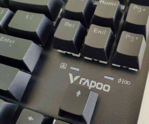 雷柏V500PRO-87多模版键盘面板采用的是金属材质,金属面板表面磨砂设计,整体质感和手感表现不凡。键盘右下角的大小写切换以及充电模式指示灯。