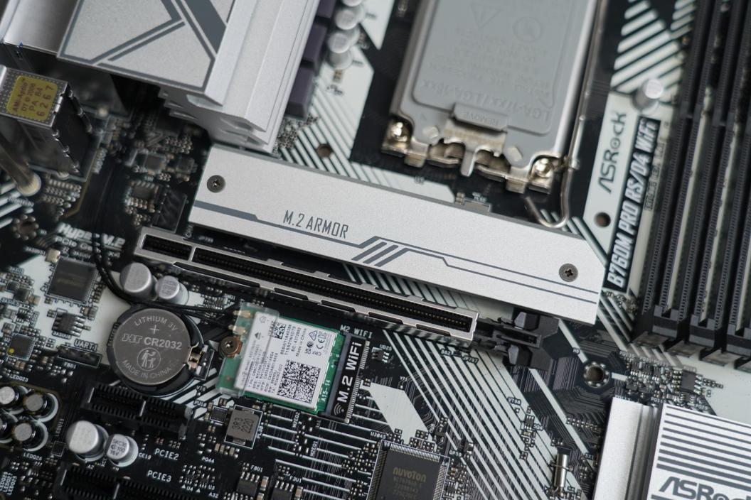 在扩展插槽方面,华擎B760M PRO RS/D4 WiFi提供了一个带合金装甲的PCIe 4.0 x16显卡槽以及两个PCIe 4.0 x4的M.2接口,其中第一个M.2接口在显卡槽的上方,出厂时有标配银色的散热片。