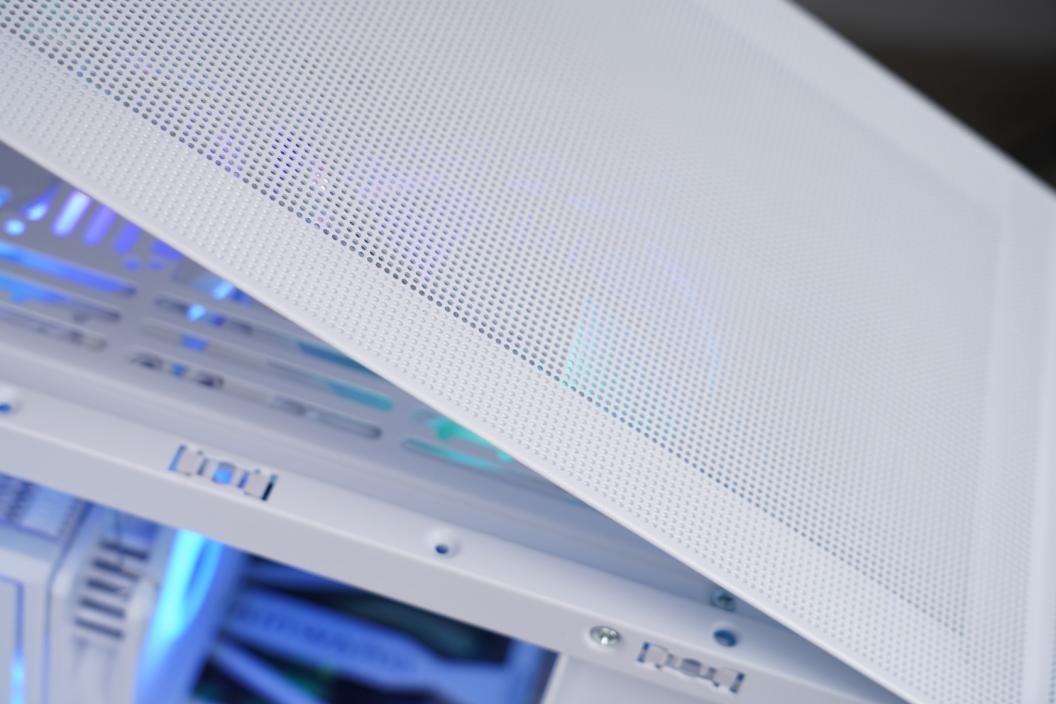 机箱内部的灯光可以穿过散热孔透出,快拆式的面板设计在后期可以更加方便地进行维护清灰。