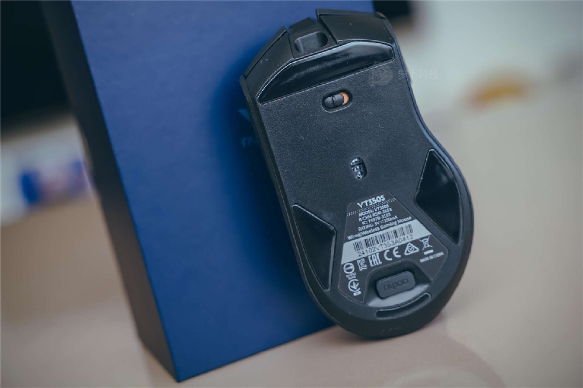 鼠标底部有一个采用磁吸设计的2.4GHz无线接收器收纳仓,方便玩家不用时收纳防丢失。上方的物理开关可以让玩家在不用的时候关闭以节省电量,周围有四块特氟龙脚贴,更换没什么难度。