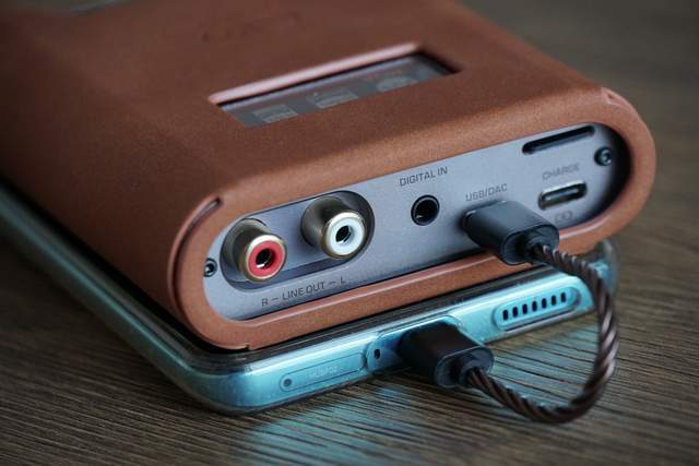 背面分布有:SPDIF接口(DIGITAL IN)支持光纤和同轴、RCA LINE OUT(接驳有源音箱)和TF内存卡插口。其中USB/DAC接口和充电口均为Type-C型,日常接线时务必留意对准。