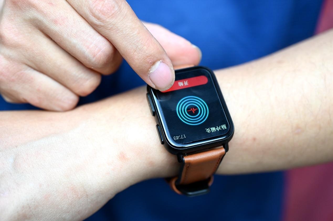 在手表的侧边有镭射心电图标志,测量心电图的时候,触摸这个位置就可以完成相关数据测试。