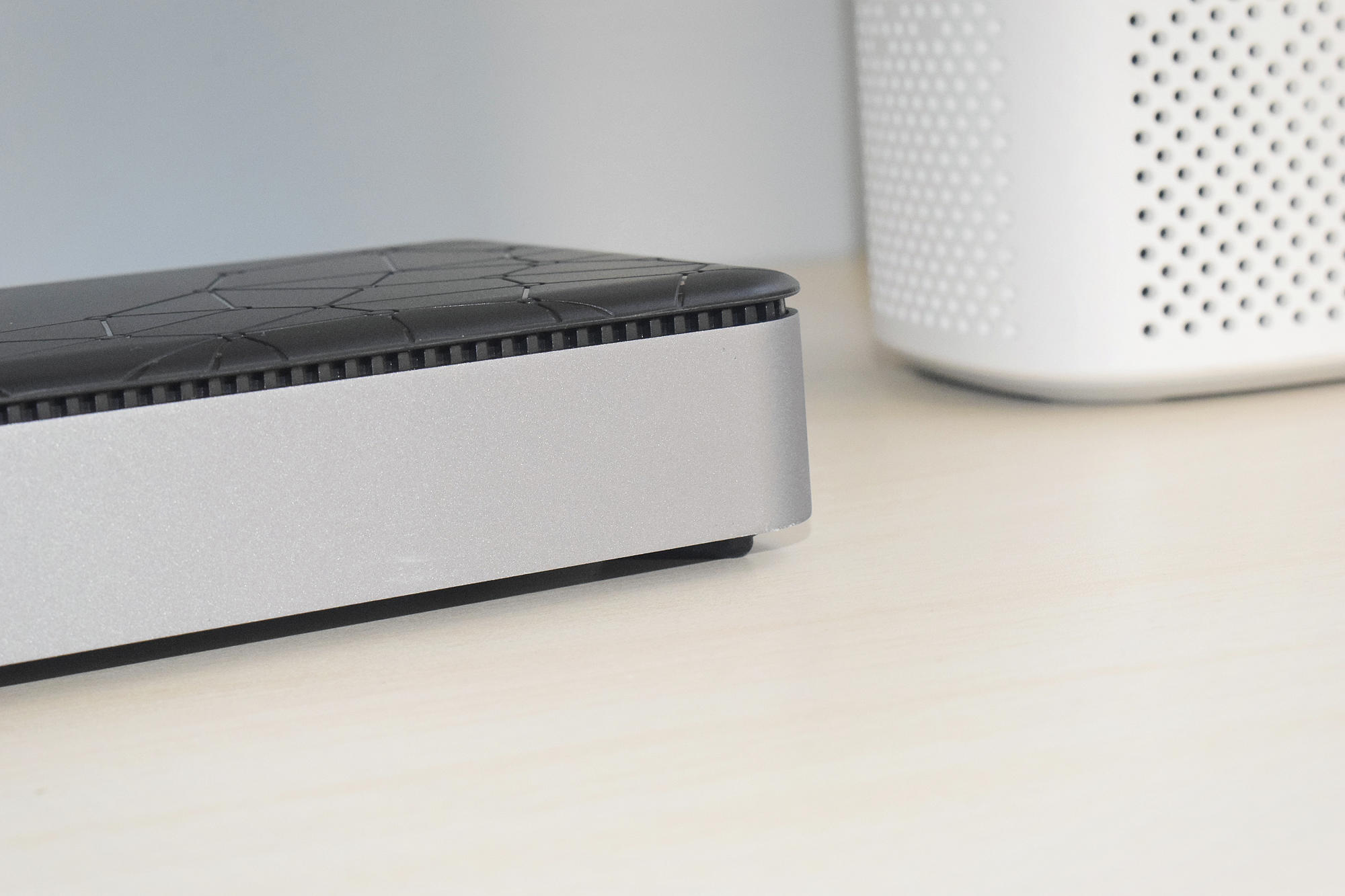 机身背部密麻的散热孔,四周垫脚有些低,如果能再高些就更好了。当然在使用时你也可以完全把它立起来放在桌面上,散热效果会更好。