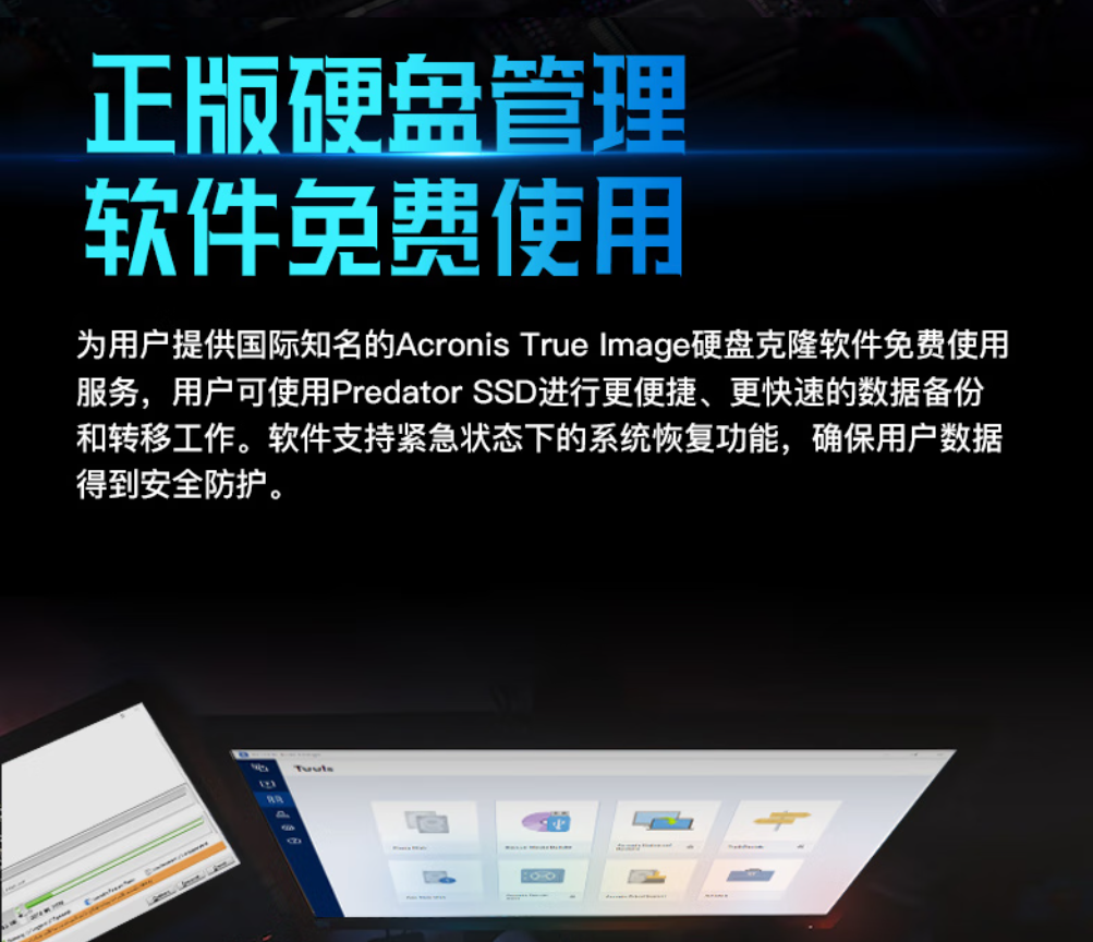 转移系统盘,通常比较麻烦,有各种教程,对于不是熟悉电脑的人来说很是繁琐,也容易出问题。而购买宏碁的SSD硬盘,可以免费获得授权的国际知名软件Acronis True Image硬盘克隆,软件免费使用。那么用这个正版知名软件,进行更换硬盘的操作,作为普通消费者来说,简单、可靠、安全。
