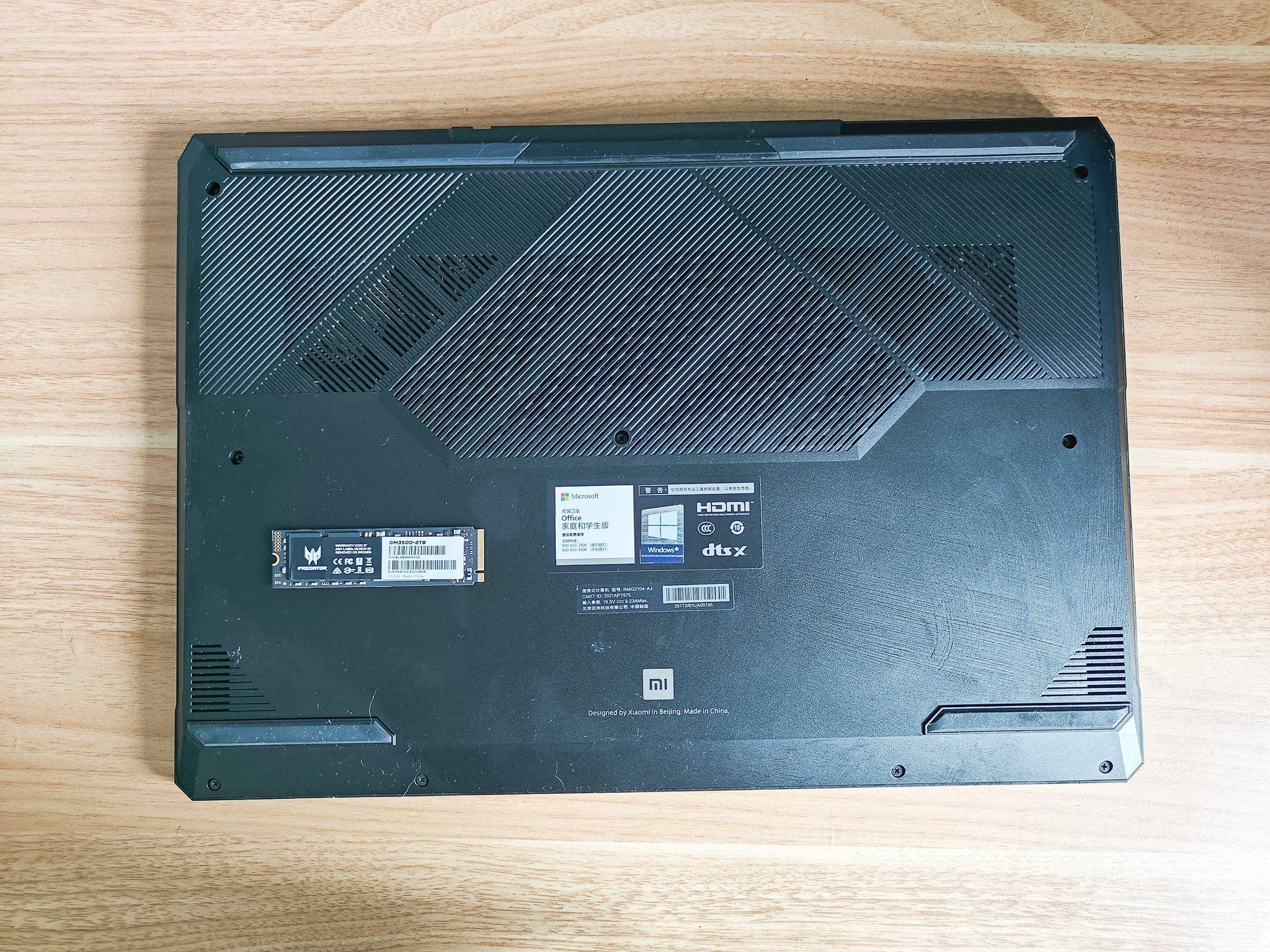 拿掉金属罩子,看到有2个M.2 SSD硬盘位置,将这款宏碁掠夺者GM3500安装到空的硬盘位置上,左侧是是原来的系统盘。