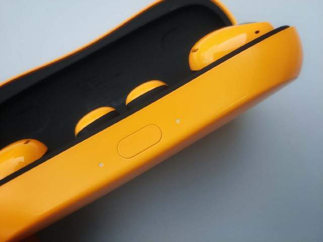 这是充电仓开启按键的位置。按键左右两侧依旧设置了指示灯。这两个指示灯对应内里耳机的充电效果。如单一耳机放入指示灯只显示放入一侧的充电状态。