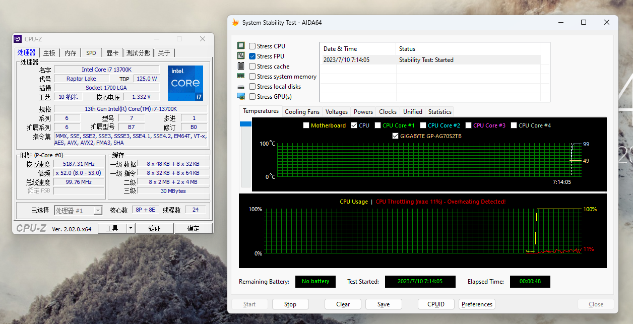 我这里0.1V调整一次成功,轻松进入系统,此时再次对13700K进行FPU测试,可以看到温度被牢牢的控制在82摄氏度,这样的工作状态就非常让人放心了。