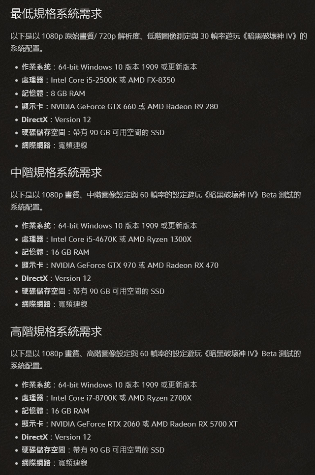 从动视暴雪官网上所公布的PC配置要求可以看到,《暗黑破坏神4》的最低配置要求酷睿i5-2500K处理器和GTX660显卡,1080p/60fps的中阶配置为酷睿i5-4670K处理器和GTX970显卡,1080p/60fps高阶配置为酷睿i7-8700K处理器和RTX2060显卡,性能需求还算比较友好。考虑到目前2K显示器已经成为主流,所以我们在装机的时候需要选择比高阶规格配置更强的硬件才能保证足够的流畅度。
