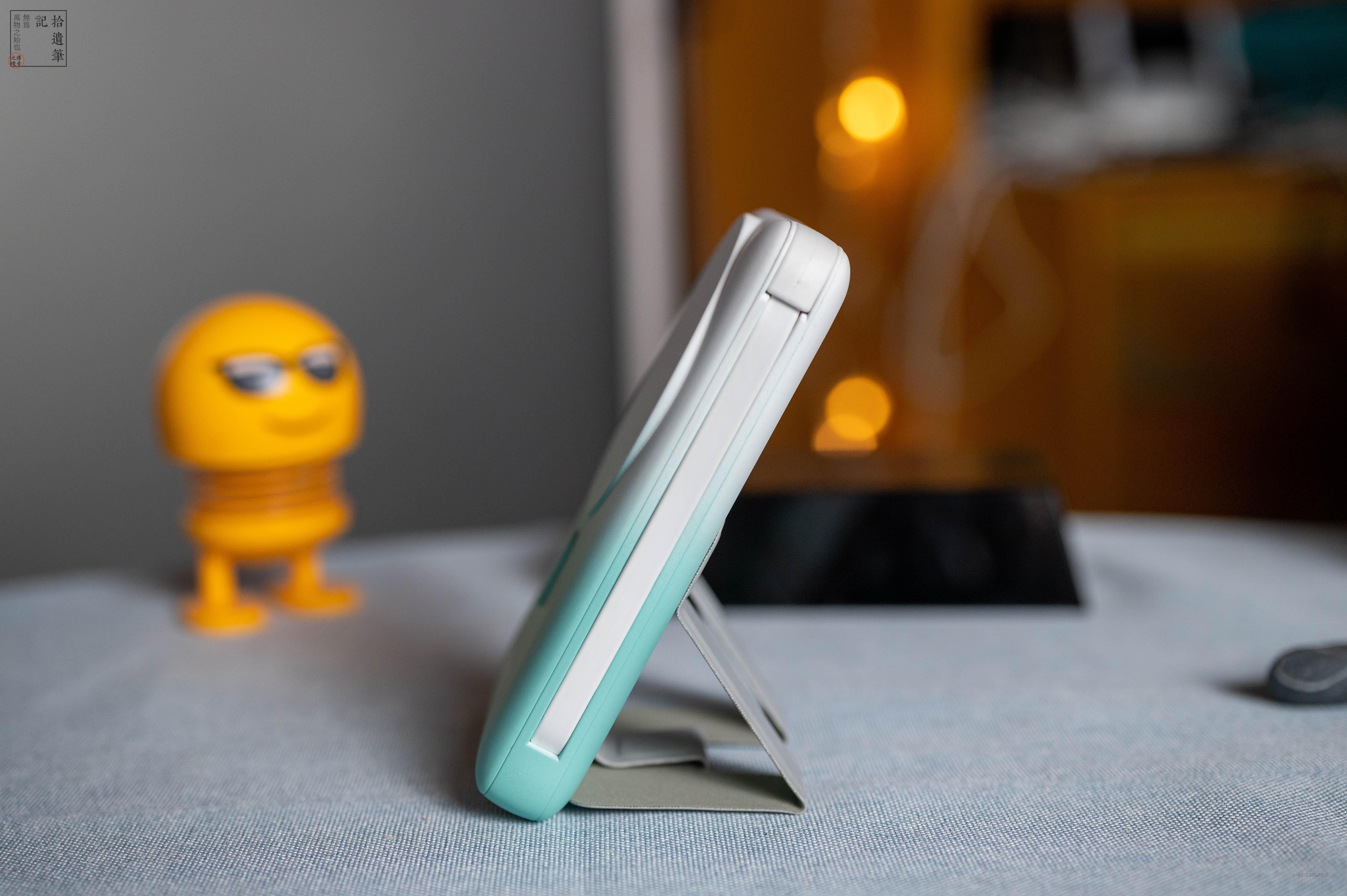 另外,在充电宝的背部带有隐形支架,这个支架可以当作手机支架使用,不用的时候可以折叠收纳起来,非常方便。再加上磁吸特性,把手机横屏放上去也会非常稳定,可以随时随地享受高清视频,或者是参加在线会议之类的。